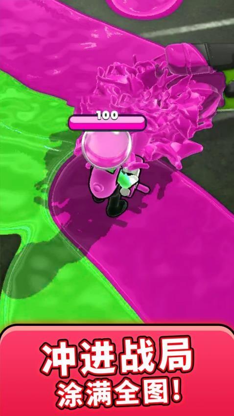 1、通过左下角摇杆操控移动,靠近区域喷射颜料抢占领地,留意时间推进节奏。