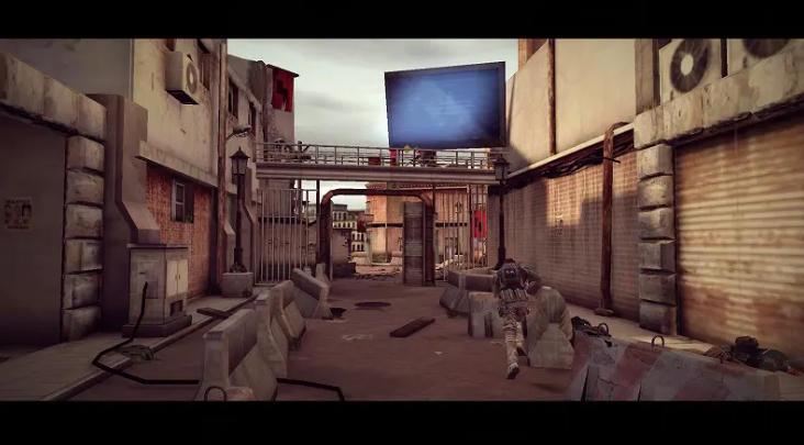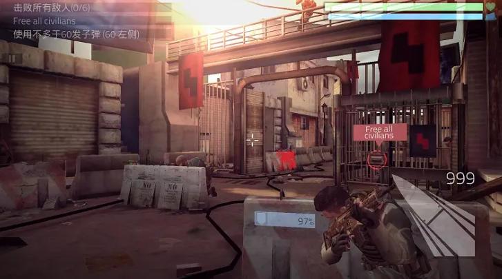 2、高精度建模的3D战场环境,子弹打在物体上会产生真实的物理反馈,玻璃碎裂和金属撞击效果都很震撼。