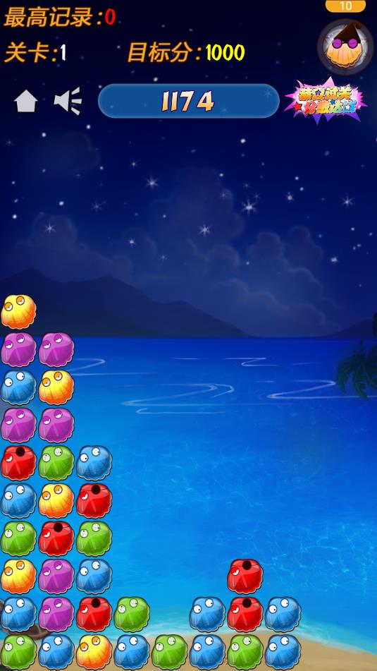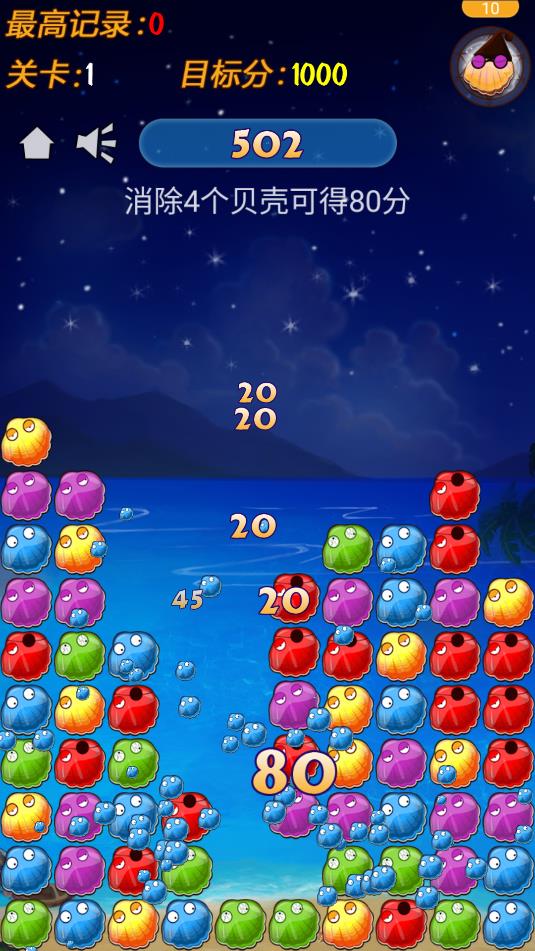 3、消除的贝壳数量越多,分数就越高,达到目标分数1000分时,即可通关。
