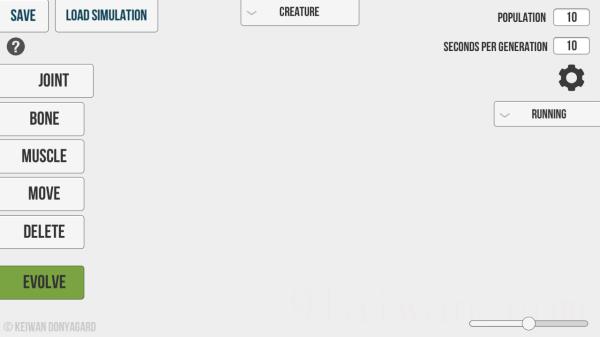 1、进入游戏,先点击【EVOLVE】按钮,让初始的红色小球开始进化,同时可查看【CREATURE】相关设置。