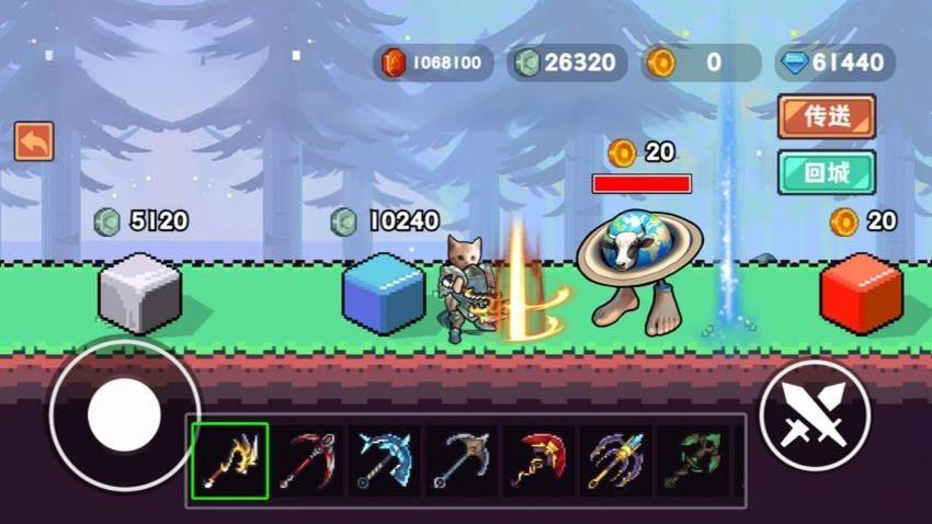 1、靠近绿色方块,点击右下角双刀图标可攻击挖掘,获取资源用于升级镐子。