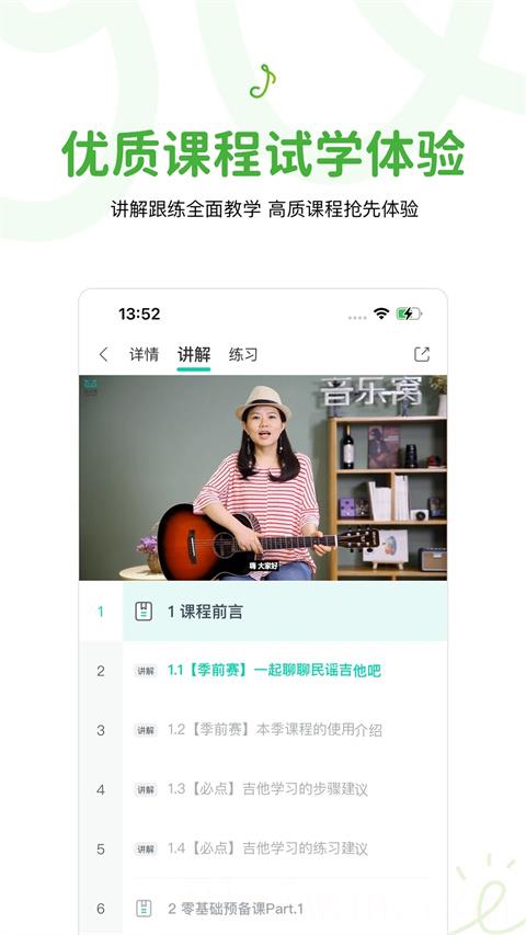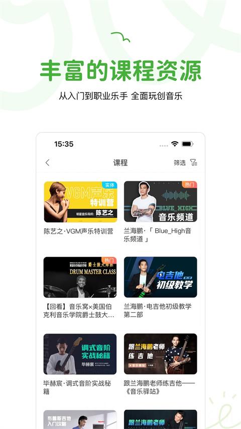 1、录播课:吉他、尤克里里、爵士鼓等多种课程选择,满足各阶段学习需求;无须预约,随时观看,想学就学。