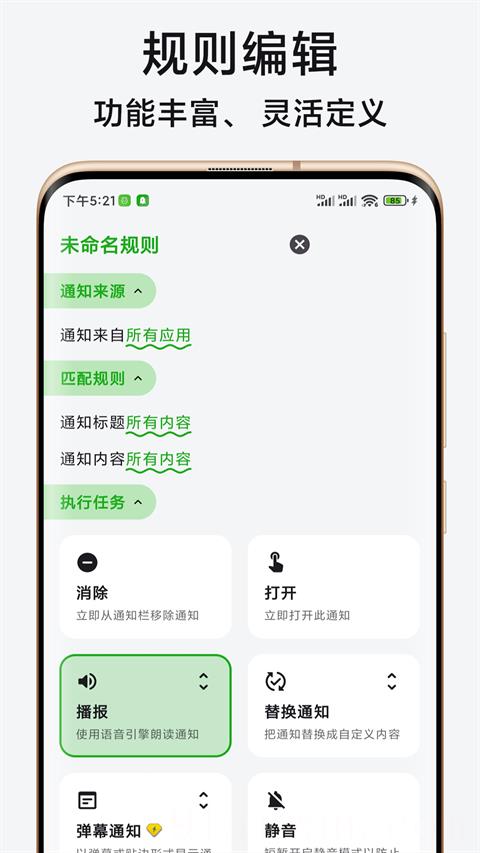 可依需求设置若干通知匹配规则,用于准确识别和分类其他APP的推送通知。