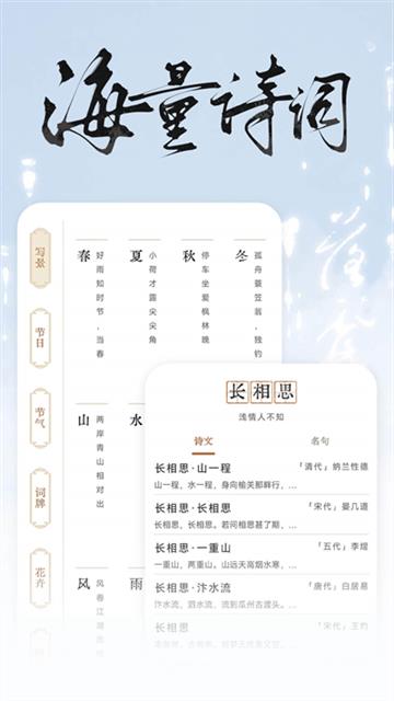1、诗歌爱好者可以下载此软件重温诗歌之美,优雅的中式精致设计让您有如画般的感觉