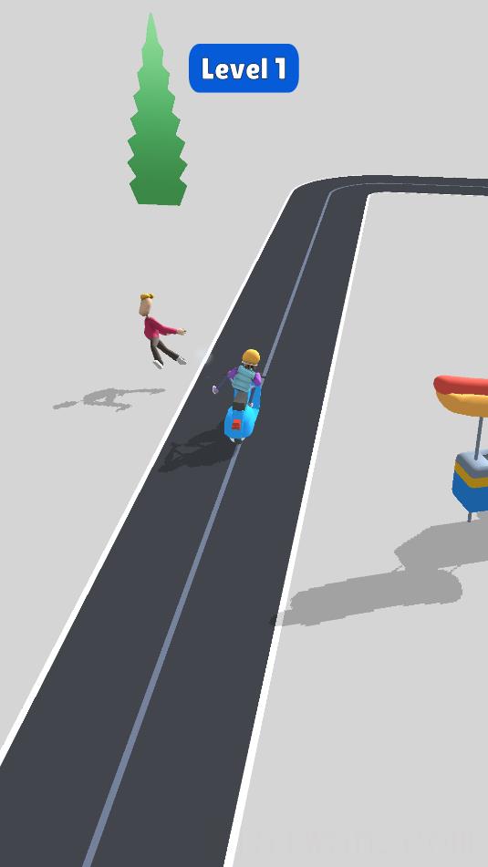 2、动态场景设计:关卡涵盖平直路、弯道、坡道,雨天路面打滑,摊贩推车随机滑动,场景元素带来多样挑战。