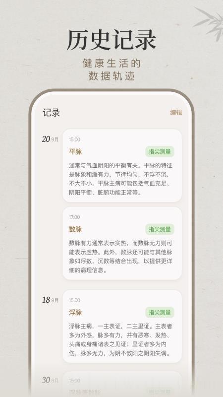 3、界面设计充满中医风格,背景融入传统文字元素,脉诊图示还原中医脉诊场景,营造出浓厚的中医养生氛围。