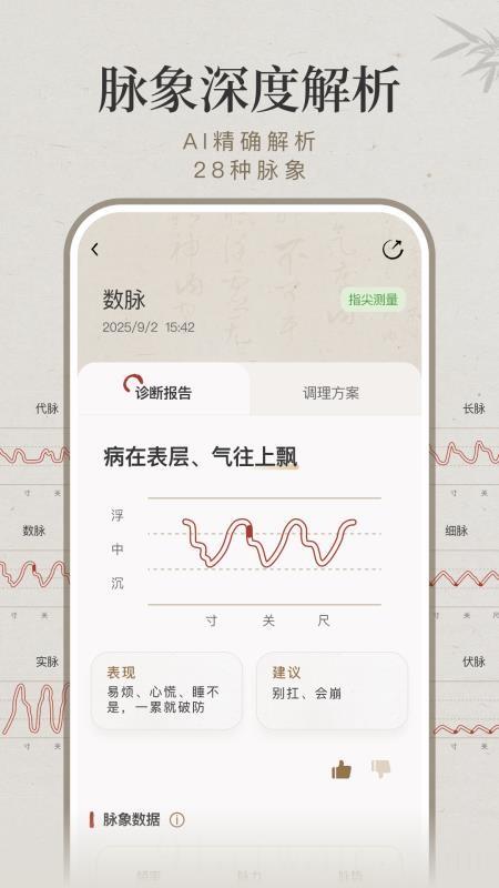 1、脉诊检测功能,支持指尖测量脉象,模拟中医脉诊流程,帮助用户初步了解自身脉象状况。