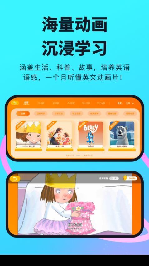 1、提供生动有趣的动画教学课程,通过情景对话和互动游戏帮助孩子自然习得英语听说能力。