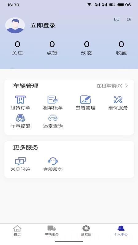 2、界面设计以蓝色作为主色调,功能区域划分清晰,顶部突出展示租赁服务与车辆资源信息。