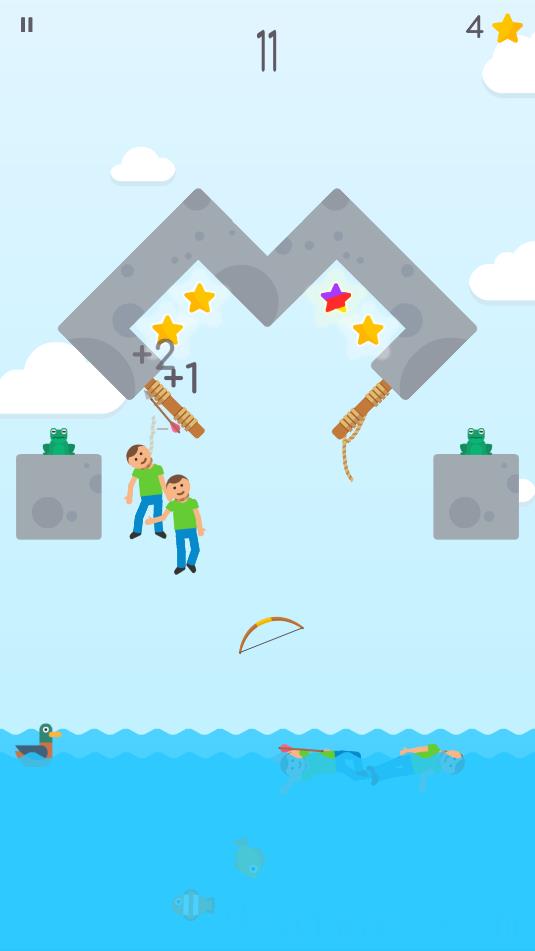 1、游戏中,向后滑动,让箭头方向指向小人的绳子,松开手指即可射出箭矢射断绳子。