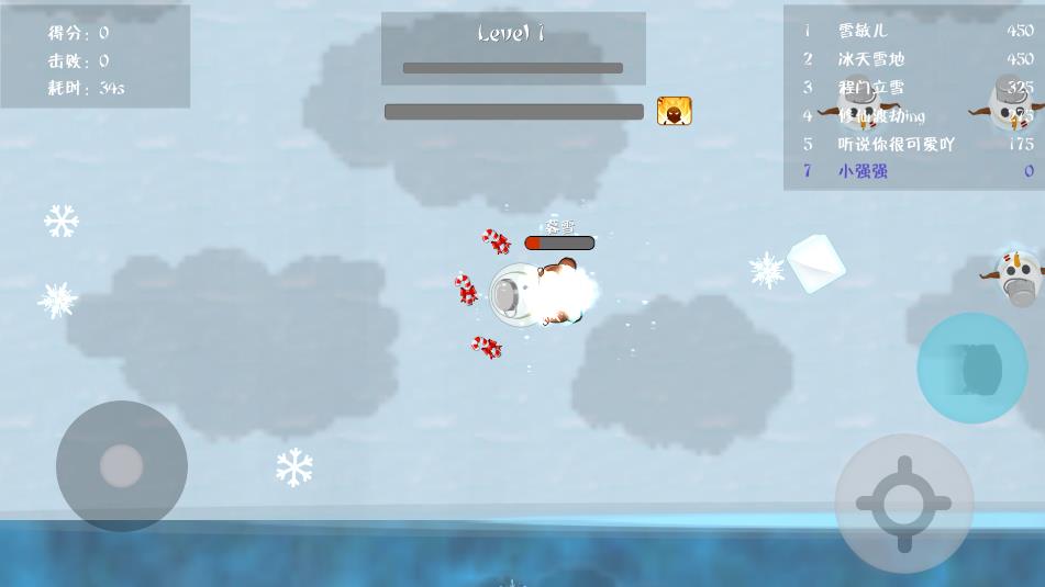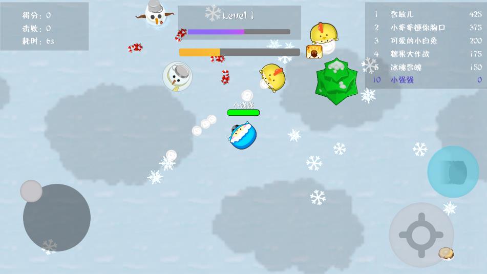 2、游戏中,滑动左下角的轮盘控制角色移动,点击右下角的按钮可以发射出雪球。