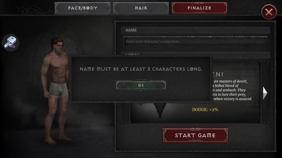 2、完成角色命名、【NOSFERATU】血统选择后,点击【STARTGAME】,正式踏入暗黑奇幻世界。