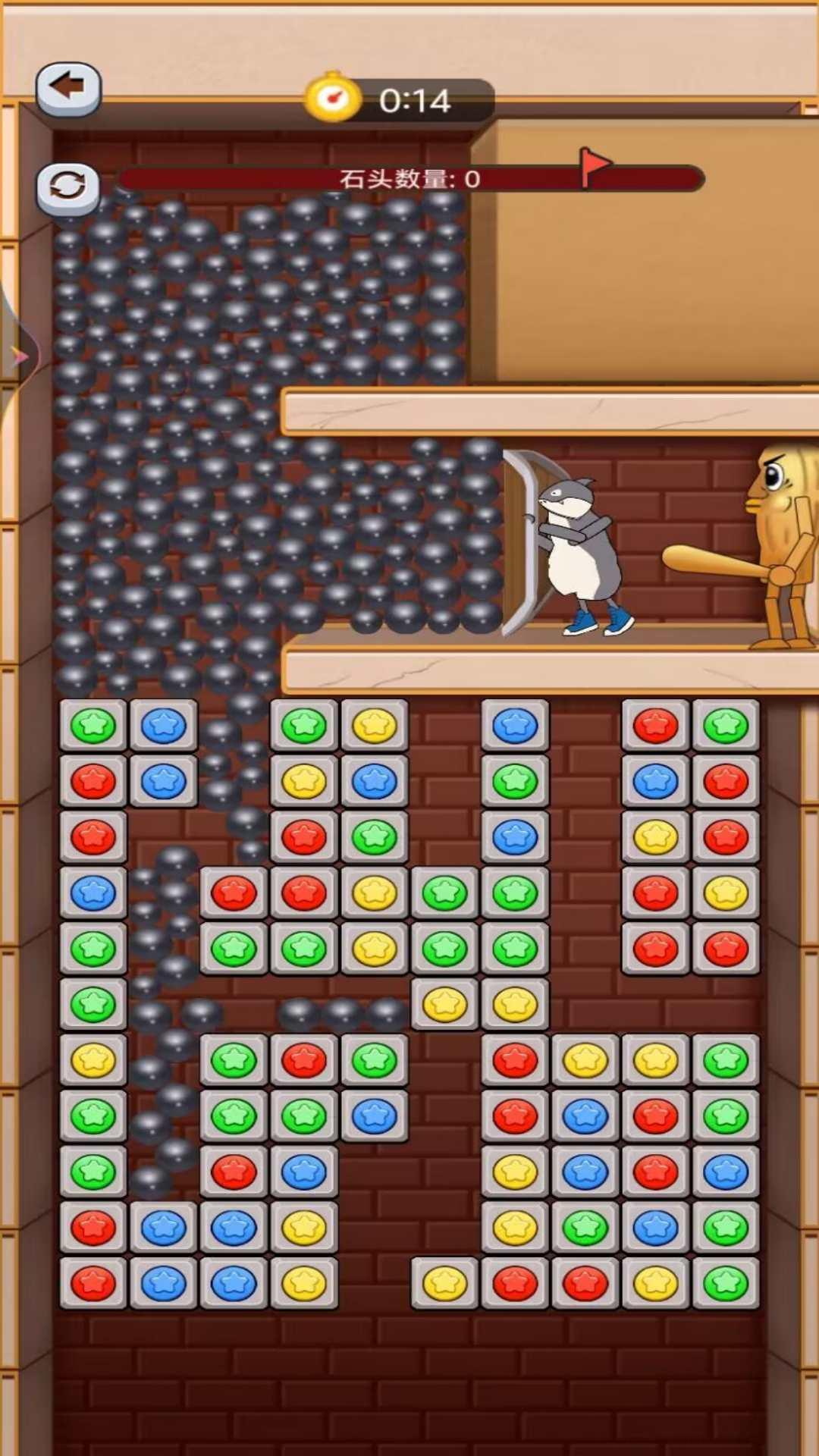 2、消除彩色方块,让石头下落,保护角色,完成关卡任务。