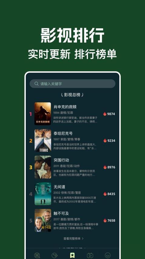 2、提供排行榜功能,展示热门影视,帮助用户了解当前热门剧集趋势,引导用户选择观看,快速找到受欢迎的优质内容。
