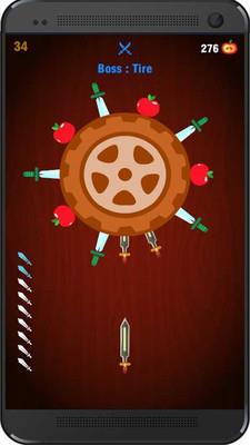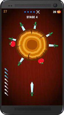 3、持续向木桩扔刀,避免刀与刀之间碰撞,逐步填满木桩的刀位,积累分数提升游戏进度。