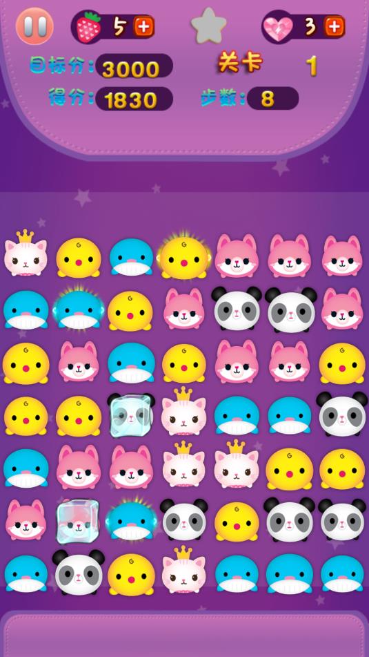 3、游戏中,点击滑动连接相同的动物来消除获得分数,20步数里,需完成3000分数即可通关。