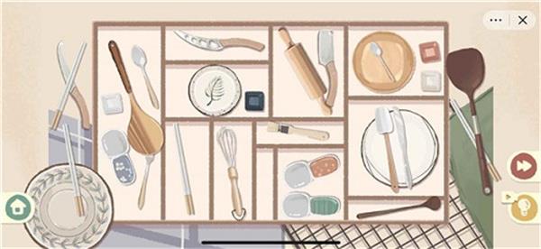 2、在红色框内的区域,将杂乱的厨房餐具分类整理,放入对应的格子中。