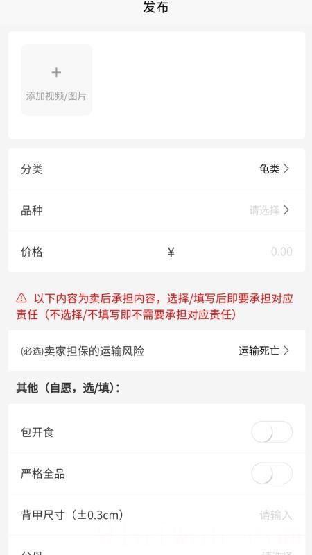 1、打开软件,点击发布,填写龟的品牌型号、添加图片,选择分类品种等信息。