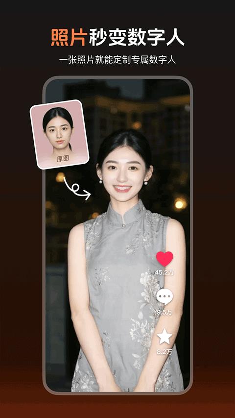 1、实现真人形象的数字克隆功能,用户可通过上传照片或短视频样本生成个性化的虚拟主播,保持外貌特征的高度还原。