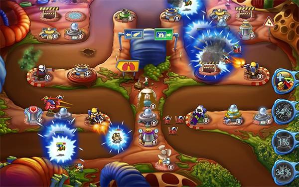 1、创意满分的人体内战场设定,从口腔到肠道都是防御阵地,17个器官地图各具特色,大脑关卡还会有特殊的神经电流特效出现。