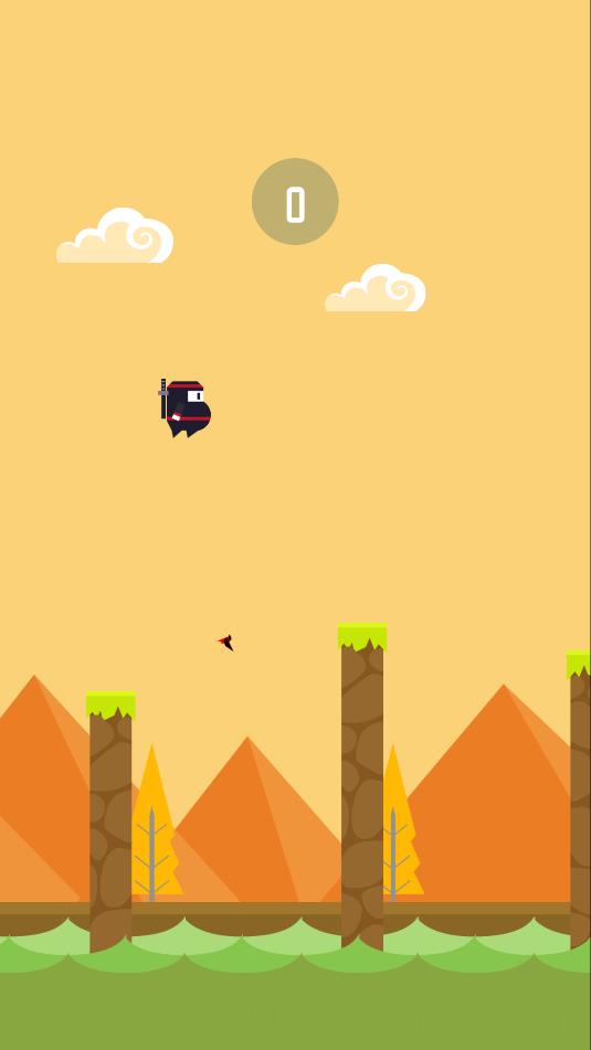 2、按住屏幕忍者会蓄力,松开手指会进行跳跃,需跳到另一根柱子上。