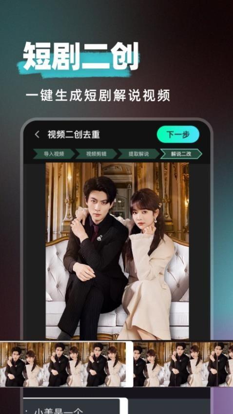 1、支持短剧二创去重与解说视频生成,一键完成二次创作剪辑,快速产出符合平台规则的原创解说内容。