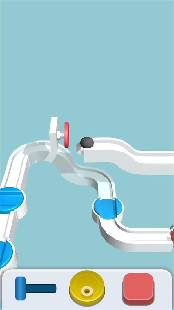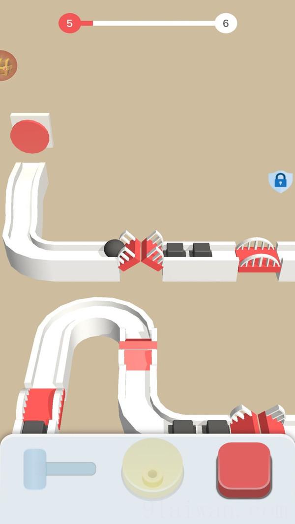 2、游玩过程中,点击底部红色按钮,控制轨道机关,使小球在轨道上继续移动,推进关卡进度。