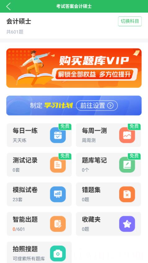 3、集成题库数据统计模块,实时显示各科目题目总量与用户当前学习进度情况。