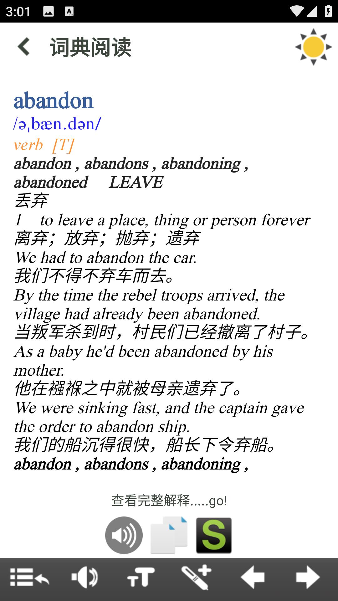 3、在词典浏览页面选择目标单词(如【abandon】),点击进入该单词的详情解释页面。