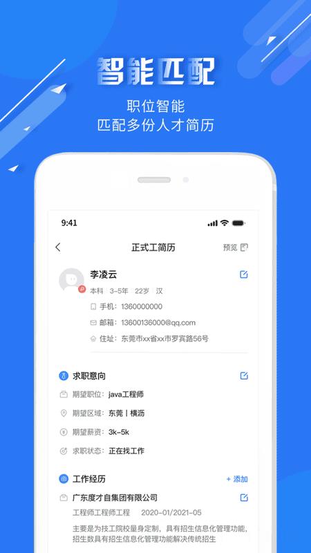 5、操作流程简洁便捷,完成简历制作后系统自动匹配对应企业,支持一键申请职位,实时获取最新招聘动态,求职过程顺畅无阻碍。