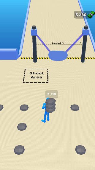 1、进入【Level1】后,在“ShootArea”区域收集石头,初始目标为积累石头数量(如1/10),逐步完成收集进度。