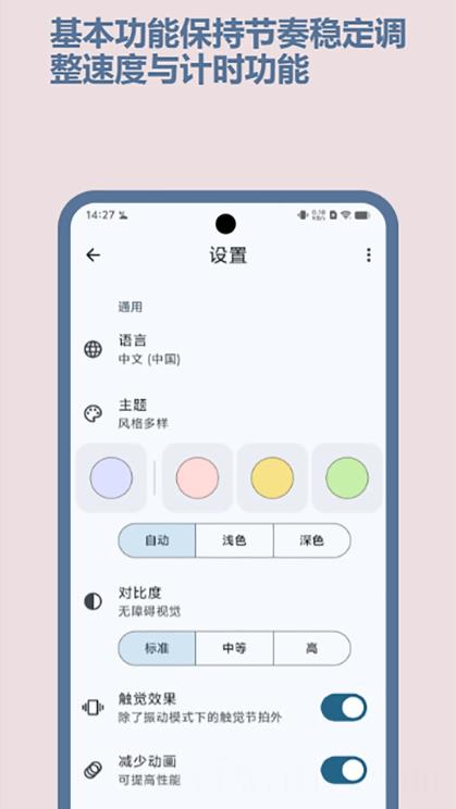 软件内设有播放控制键,可轻松开启或停止节拍。同时,还提供主题、对比度、触觉反馈等多项个性化设置,允许用户根据自己的喜好优化使用体验。