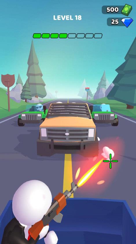 2、操控角色在公路场景中移动,瞄准前方目标发起射击,推进关卡进度。