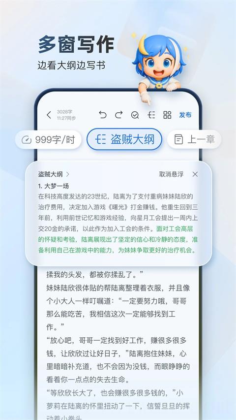 《作家助手手机版》是一款专为小说创作而设计的应用程序,由腾讯与阅文集团联合推出,融合了文学与动漫的创作元素。该软件为作家提供了强大的创作支持,帮助他们在移动端进行小说创作与发布。通过该应用,作者可以实时查看自己的作品访问量、下载量及收益等数据,全面掌握作品的表现。无论你是小说爱好者还是动漫迷,都可以在这里找到灵感并开始创作。更多优质写作应用,尽在“就来玩游戏网”!
