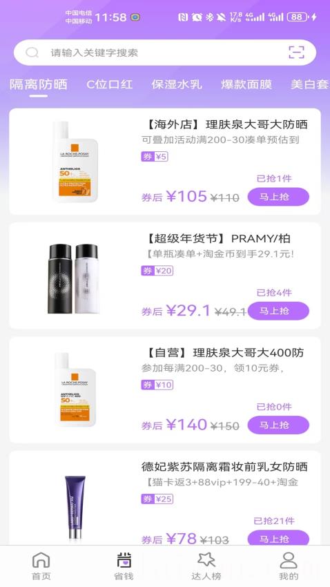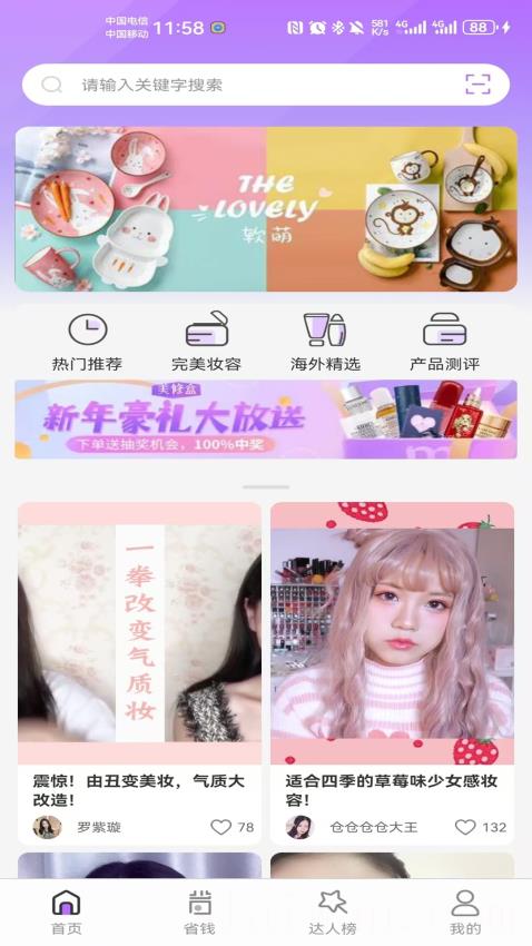 3、配备省钱达人榜等功能板块,覆盖美妆学习与相关互动的不同使用场景。
