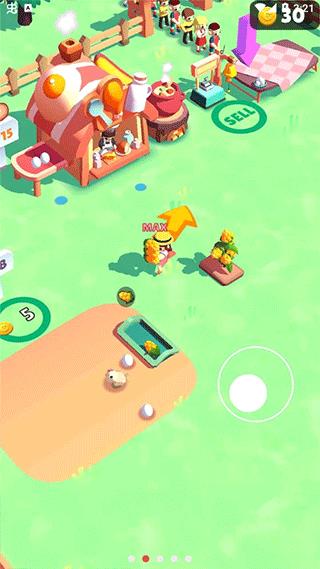 游戏玩法休闲简单,无需繁琐操作。玩家可自由规划并打造属于自己的专属农场,通过购买各类动物进行养殖,或是管理水果、鸡蛋等农产品的生产。所有产出都能在市场中出售换取金币,用于雇佣员工、提升设施等级,不断扩充农场规模。