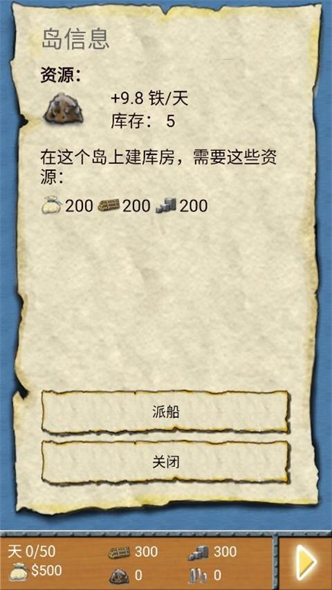 2、进入地图界面后,选择标注的岛屿,界面显示【天1/50】等资源状态,点击岛屿可查看其详细信息,推进游戏发展流程。