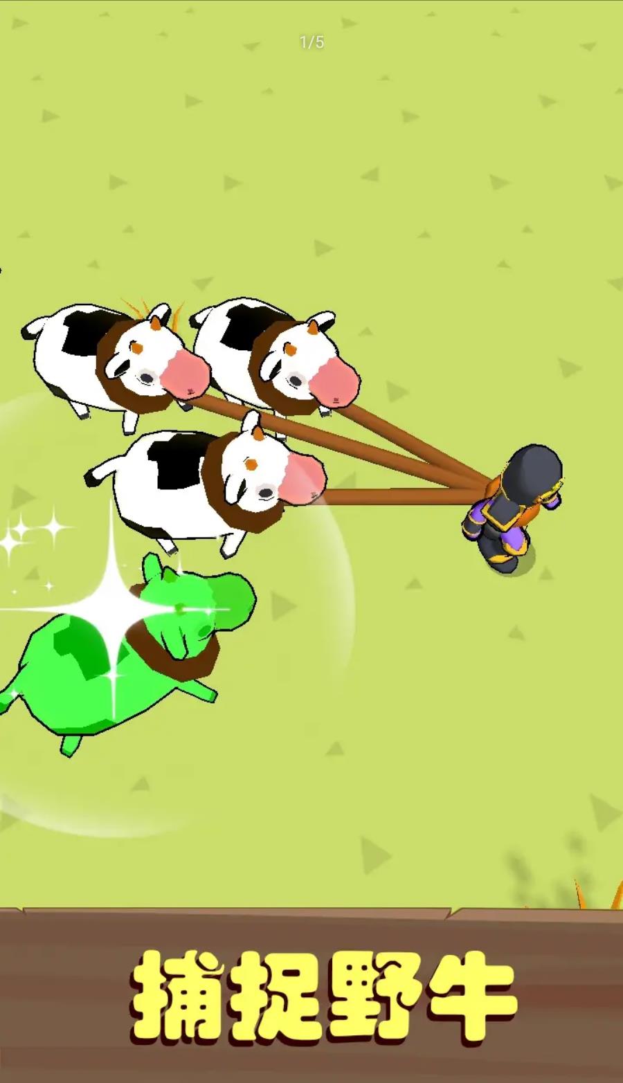 1、操控角色靠近目标奶牛,利用工具触发捕获,锁定被框选的奶牛,准备进行拖拽操作。