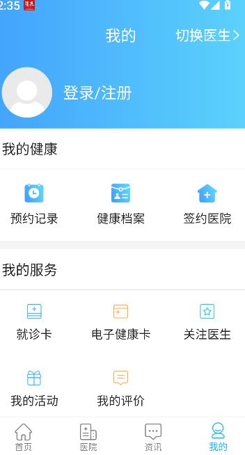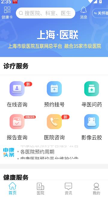 1、首页入口清晰,将挂号、问诊、报告等常用内容分类呈现。