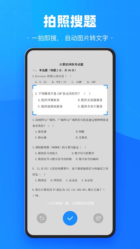 汇集多样化考试真题并配备详细解析,免费开放在线刷题服务。用户可挑选随机、顺序、按题型等多种练习方式,且练习中的错题与收藏题目将被系统自动记录保存。