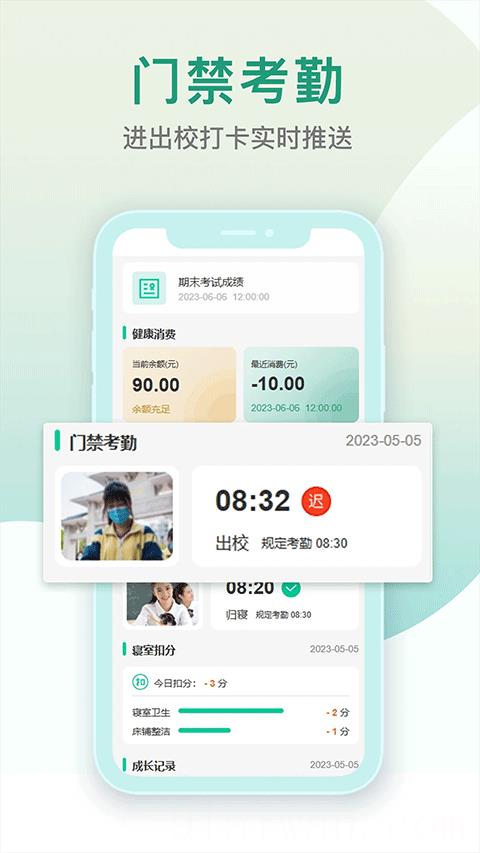 4、实时推送校门门禁考勤信息,孩子到校离校打卡时间精准同步,让家长随时掌握出行安全状态。