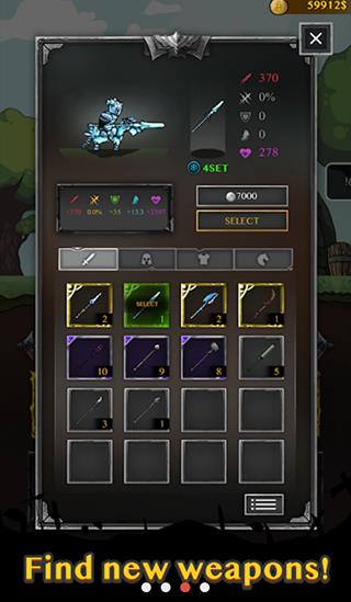 游戏操作简单直观,只需控制角色左右移动并冲向怪物即可展开战斗并将其击败。但需要时刻关注角色的血量状况,血量高低取决于所穿戴装备的品质,一旦血量耗尽便会角色死亡,同时还会损坏一件装备。