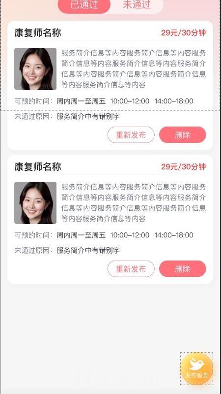 1、支持订单分类管理,按未完成已完成划分订单状态,配合服务发布功能,适配康复师的服务流程管理需求。