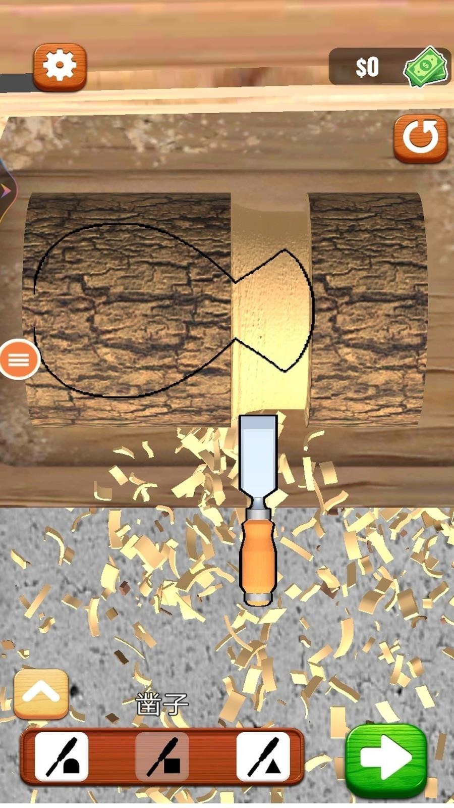 3、继续使用【凿子】工具,依照木材上显示的哑铃形状轮廓进行精细雕刻,完成后点击右侧箭头进入下一步。