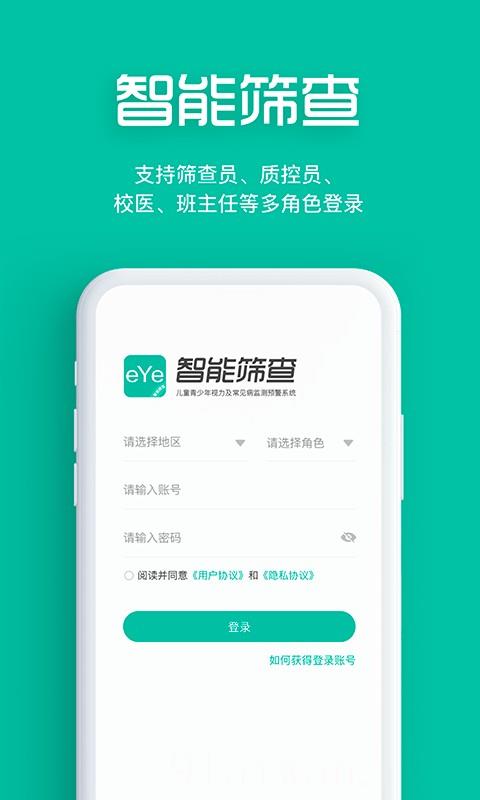 1、在智能筛查APP启动页,点击【同意】按钮,确认用户协议与隐私政策以进入登录界面。